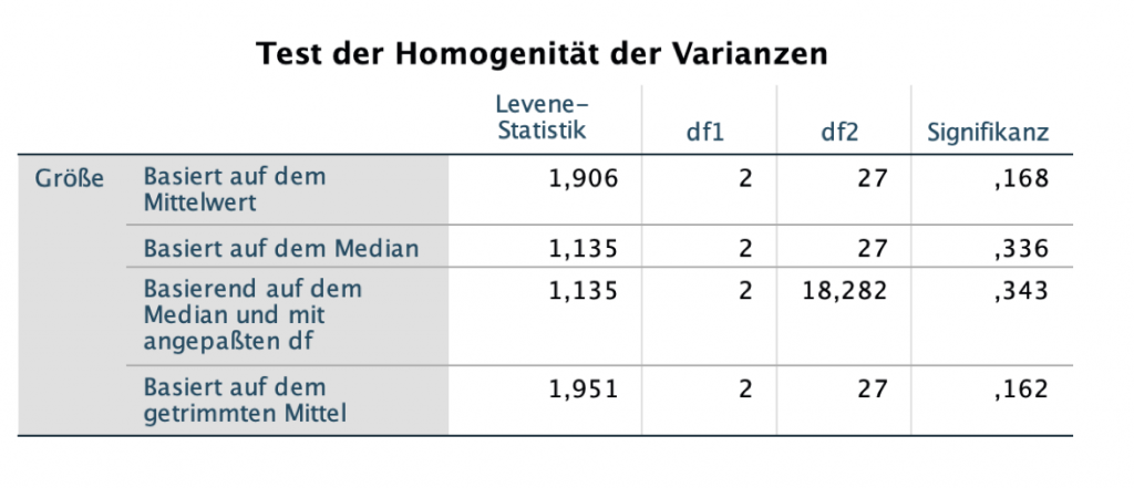 - Die Varianzen für jede Gruppe sind gleich (Homoskedastizität). Das kann mit dem Homogenitätstest der Varianzen überprüft werden.