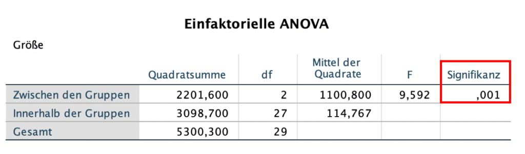 Die Wahrscheinlichkeit, einen F-Wert von 9.592 oder größer mit diesen Freiheitsgraden zu erhalten, liegt bei 0.001, wie sich der Spalte Signifikanz entnehmen lässt.