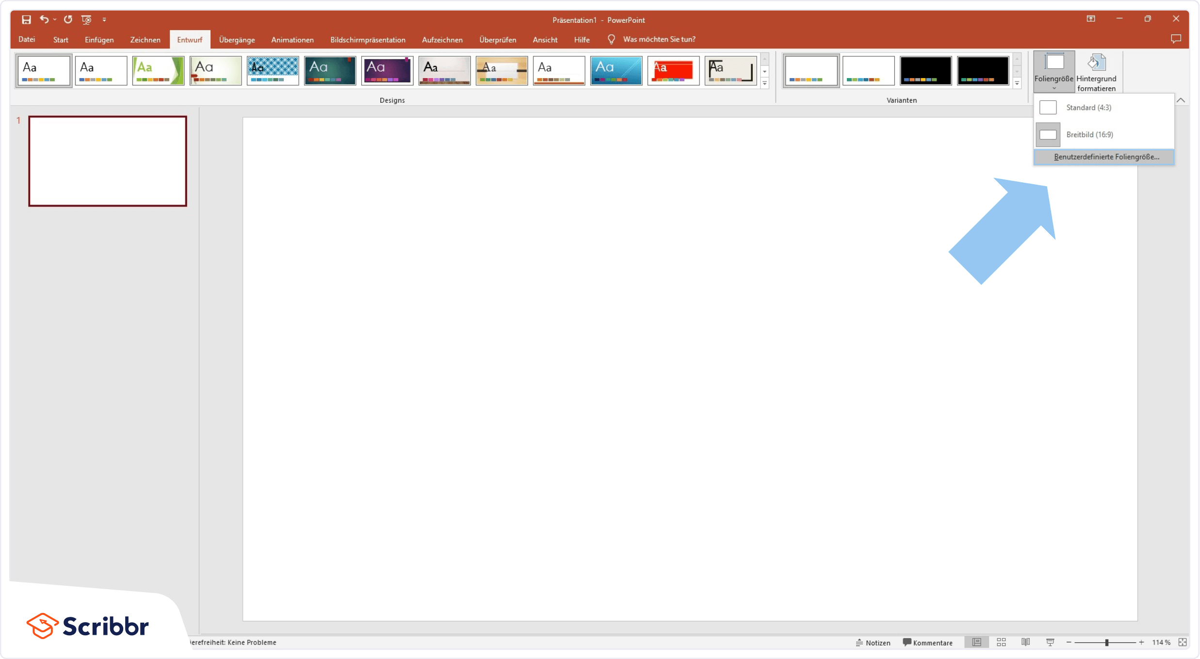 Anschließend klickst du rechts auf den Button ‚Foliengröße‘ und wählst ‚Benutzerdefinierte Foliengröße‘ aus.
