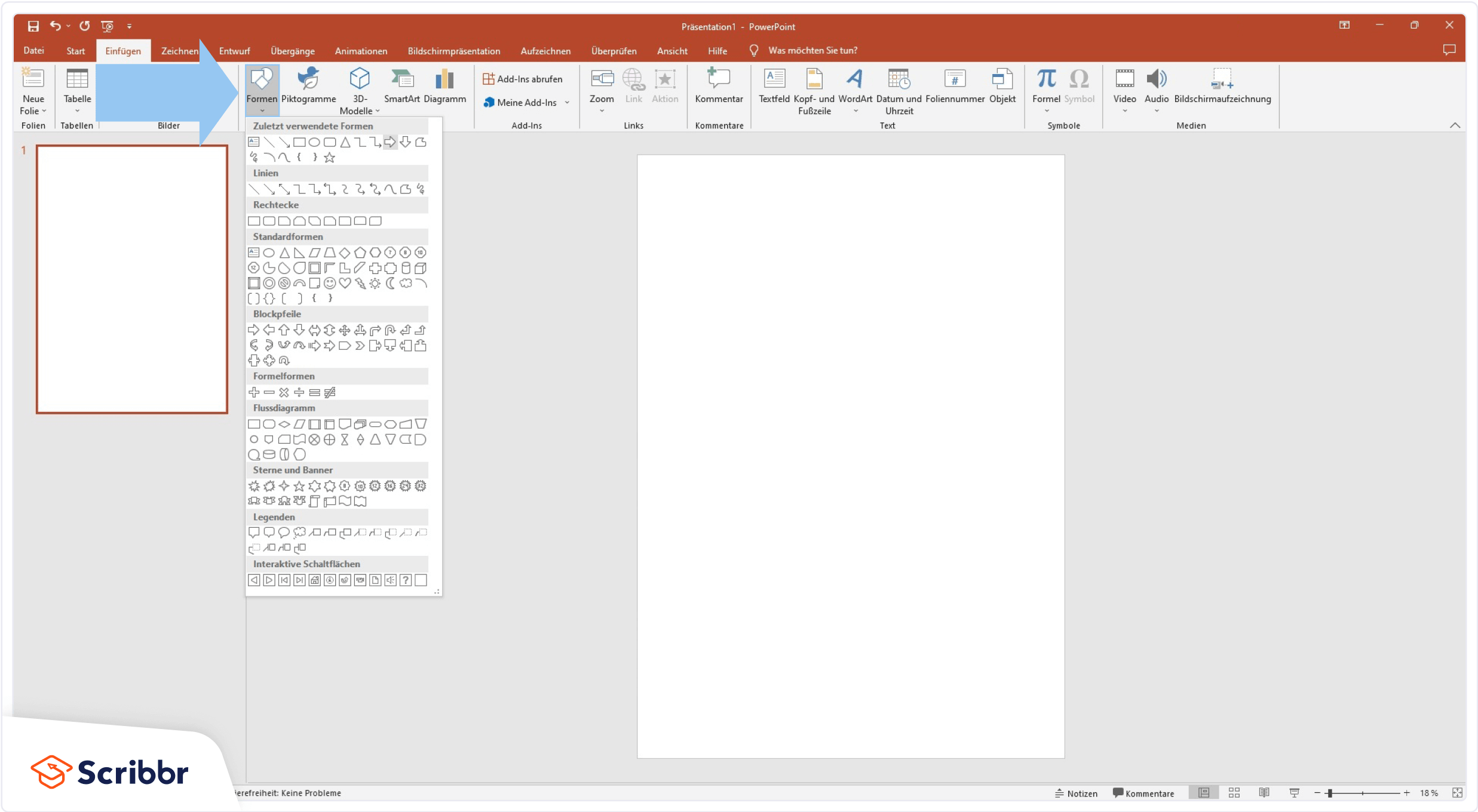 Um Formen einzufügen, klickst du im Reiter ‚Einfügen‘ auf den Button ‚Formen‘. Hier findest du eine große Auswahl unterschiedlicher Formen.